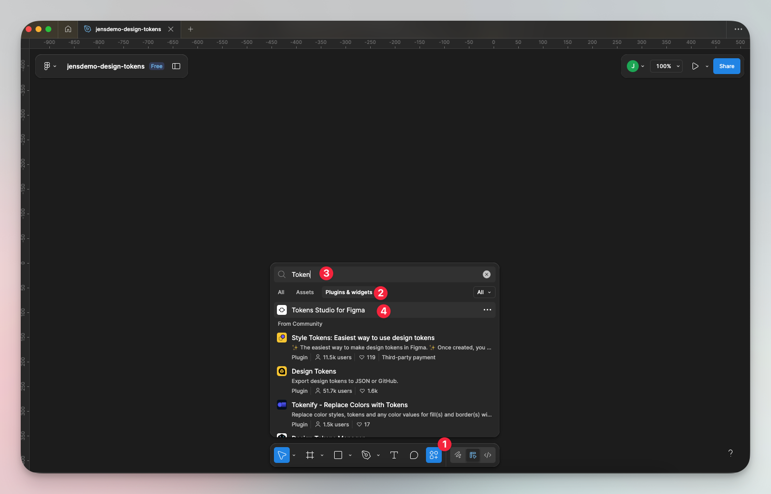 - Click on ‘Actions’, switch to the ‘Plugin & Widgets’ tab, search for ‘Tokens Studio for Figma’, and select it.