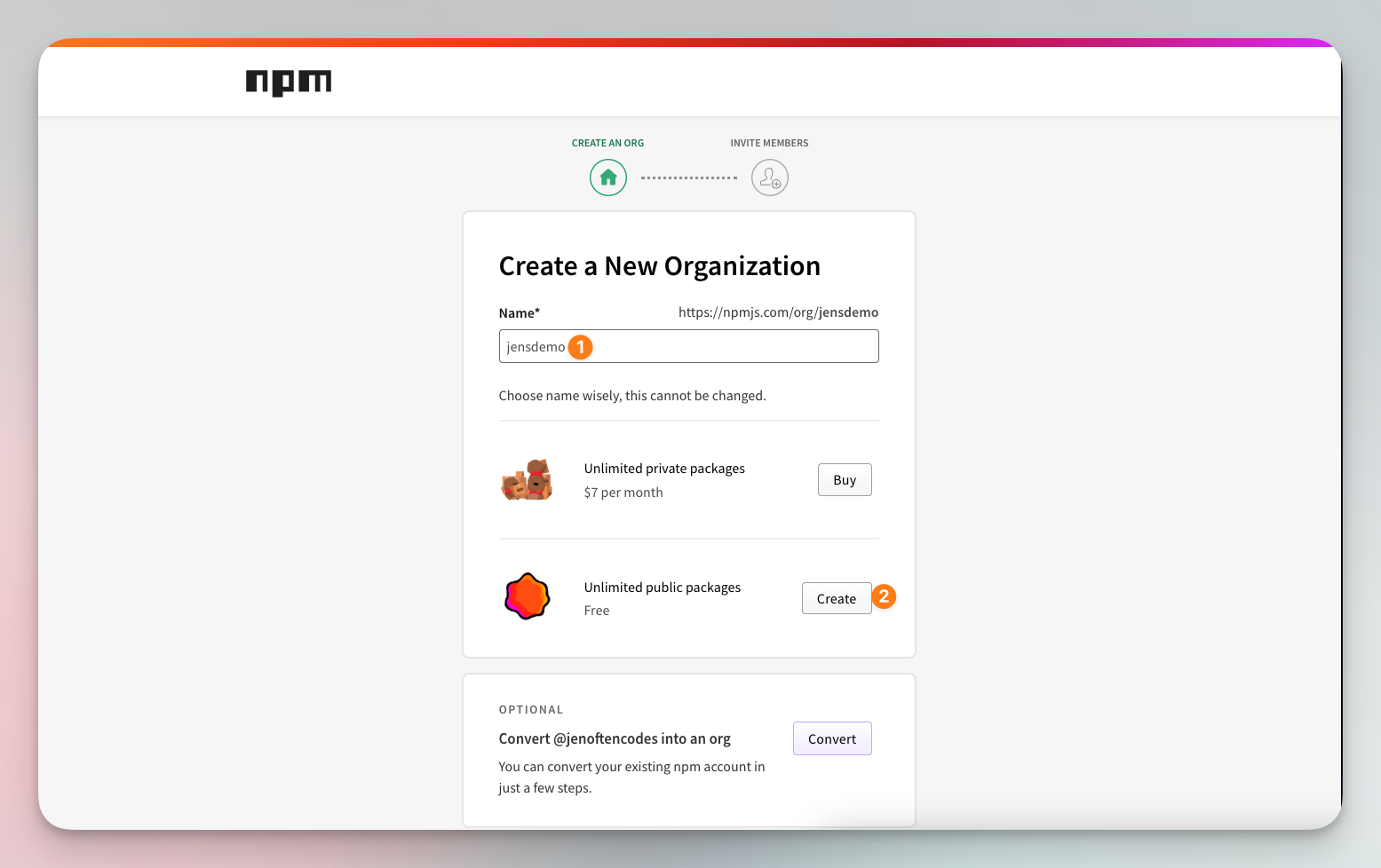 - Enter the organization name of your choice. You can select to create public or private (paid) packages. I’ll go with public.