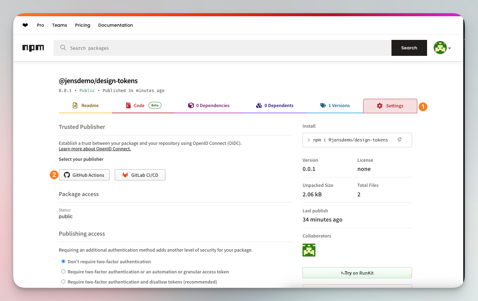 @jensdemo/design-tokens - Enter 0.0.1 as the version.
