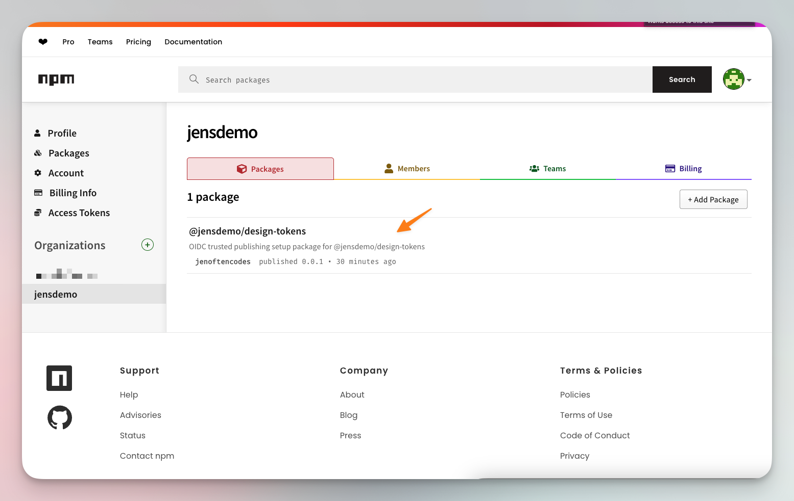 - You should see a success message. Refresh your organization’s page on npm to see the new package.