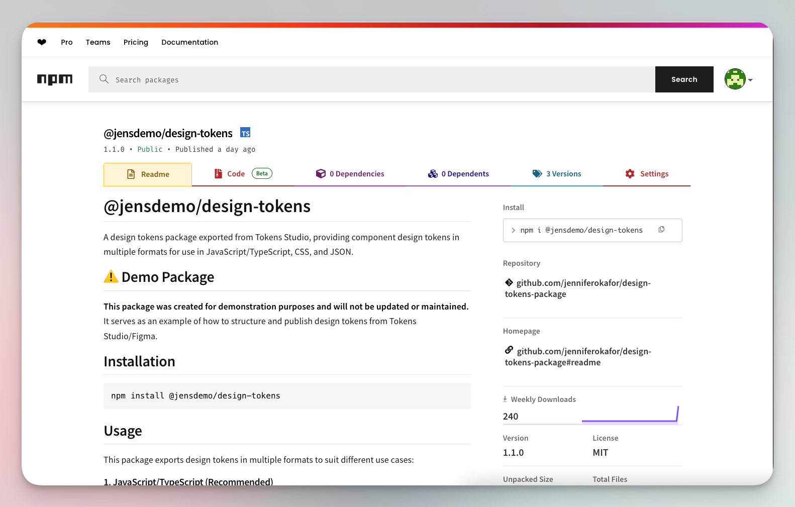 {"name": "@jensdemo/design-tokens","version": "0.0.1","description": "Design tokens from our design system.","type": "module","main": "dist/index.cjs","module": "dist/index.js","types": "dist/index.d.ts","exports": {".": {"types": "./dist/index.d.ts","import": "./dist/index.js","require": "./dist/index.cjs"},"./css/variables.css": "./dist/css/variables.css","./json/components.json": "./dist/json/components.json","./raw/tokens.json": "./tokens.json"},"files": ["dist","tokens.json","README.md","LICENSE"],"scripts": {"tokens:build": "style-dictionary build --config sd.config.js --verbose","tokens:watch": "style-dictionary build --config sd.config.js --watch --clean","prepublishOnly": "npm run tokens:build"},"keywords": ["design-tokens","style-dictionary","tokens-studio"],"author": "jenoftencodes","license": "MIT","bugs": {"url": "https://github.com/jenniferokafor/design-tokens-package/issues"},"homepage": "https://github.com/jenniferokafor/design-tokens-package#readme","devDependencies": {"@tokens-studio/sd-transforms": "^2.0.1","style-dictionary": "^5.1.1","typescript": "^5.9.3"}}